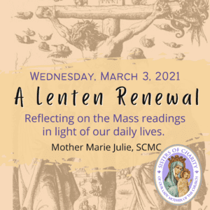 A Lenten Renewal:Reflections on the Mass readings in light of our daily livesBy Mother Marie Julie, SCMC My Dear Good People, This isn’t about today’s Gospel, but it’s about our relationship with God. Each day I pray a holy hour in the chapel we call Cor