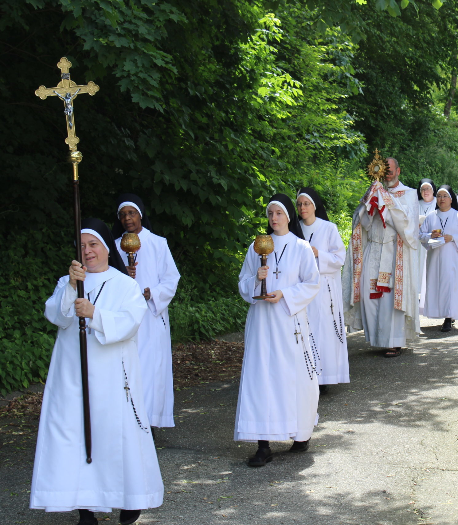 This afternoon at 2:00 (Eastern Time) the Sisters will reverently walk with Jesus in our own Corpus Christi procession throughout our home and along the two or three streets surrounding our Motherhouse. Do come along. We’ll each tuck you into the pocket of our heart. We’d love to have you with us.