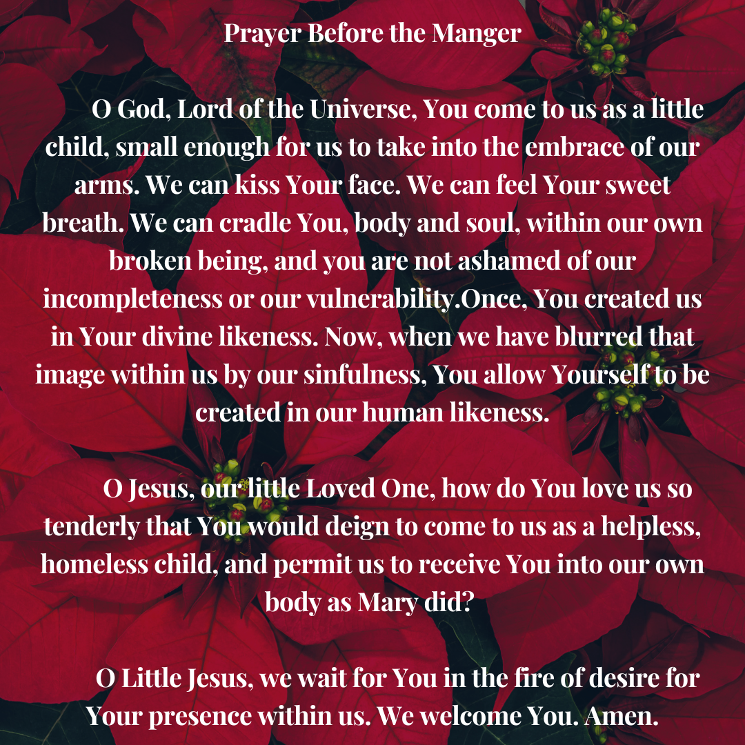 In case you missed it last night, we have two gifts for you, tokens of our love and appreciation. First, a prayer written for you to pray before the manger.